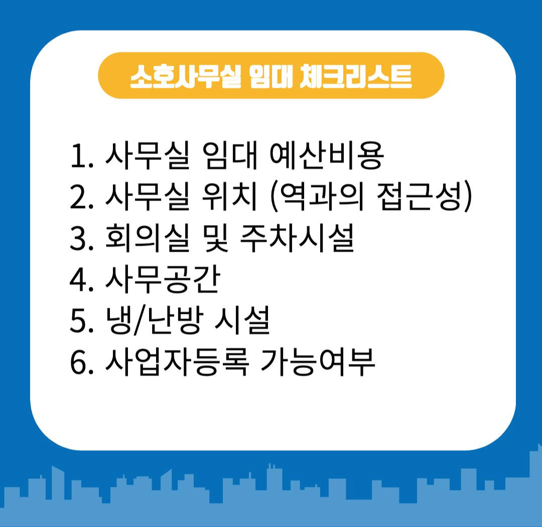 처음 사업을 시작할 경우 사무실 구축에 투입되는 예산은 매우 한정적입니다. 처음엔 소호사무실, 즉 사무실을 더 작은 단위로 임대하는 방식으로 직원 수나 사용패턴에 따라 임대 면적을 최소화한 사무실 솔루션을 많이 찾으십니다. 소호사무실 임대 시 체크리스트는 아래와 같습니다.